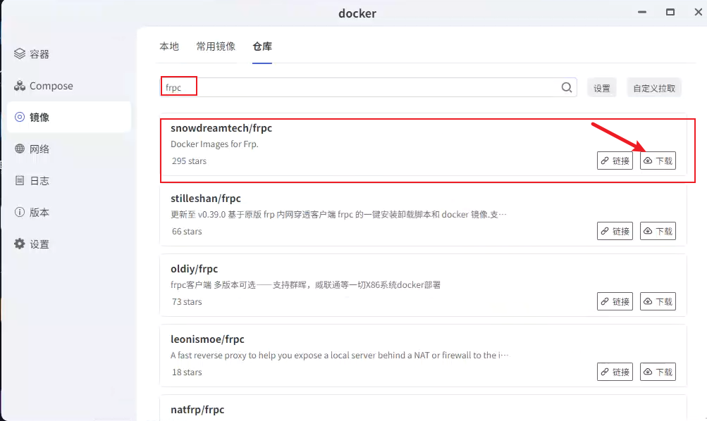 在docker镜像仓库中搜索frpc,找到如图所示镜像下载