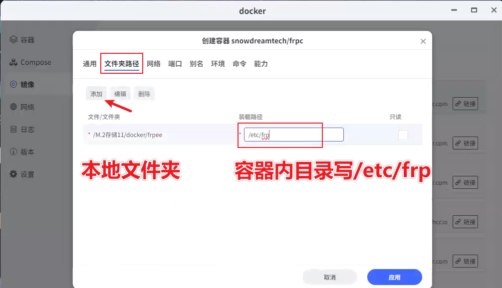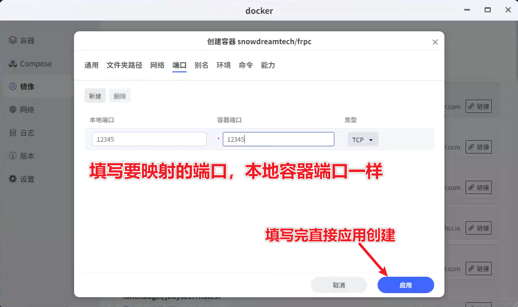 并映射要从外部访问的端口(与配置文件中的远程端口一致),本地端口和容器端口保持一致