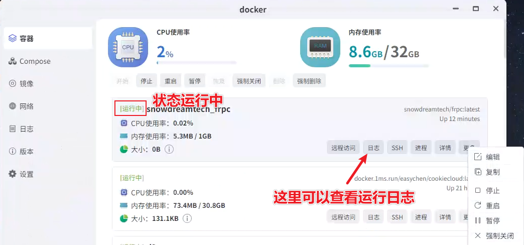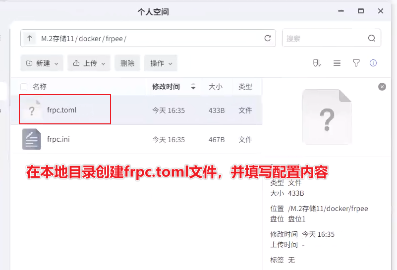 创建一个frpc.toml配置文件,配置文件内容可在frpee控制台获取,每次修改配置后记得重启容器